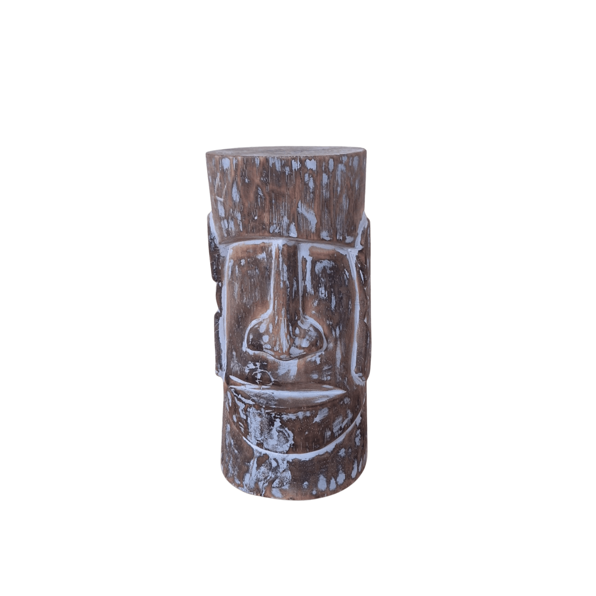 A handcrafted wooden Tiki statue carved from natural log, bringing bold tribal character and earthy charm to any space.
