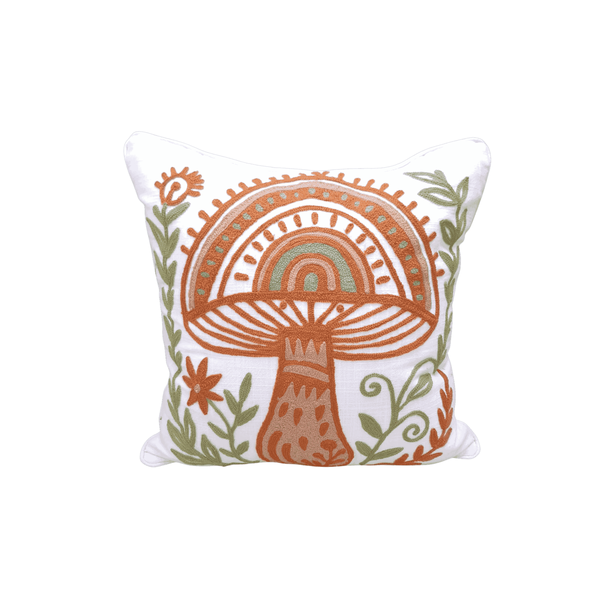 An embroidered mushroom cushion cover inspired by nature and folk art.