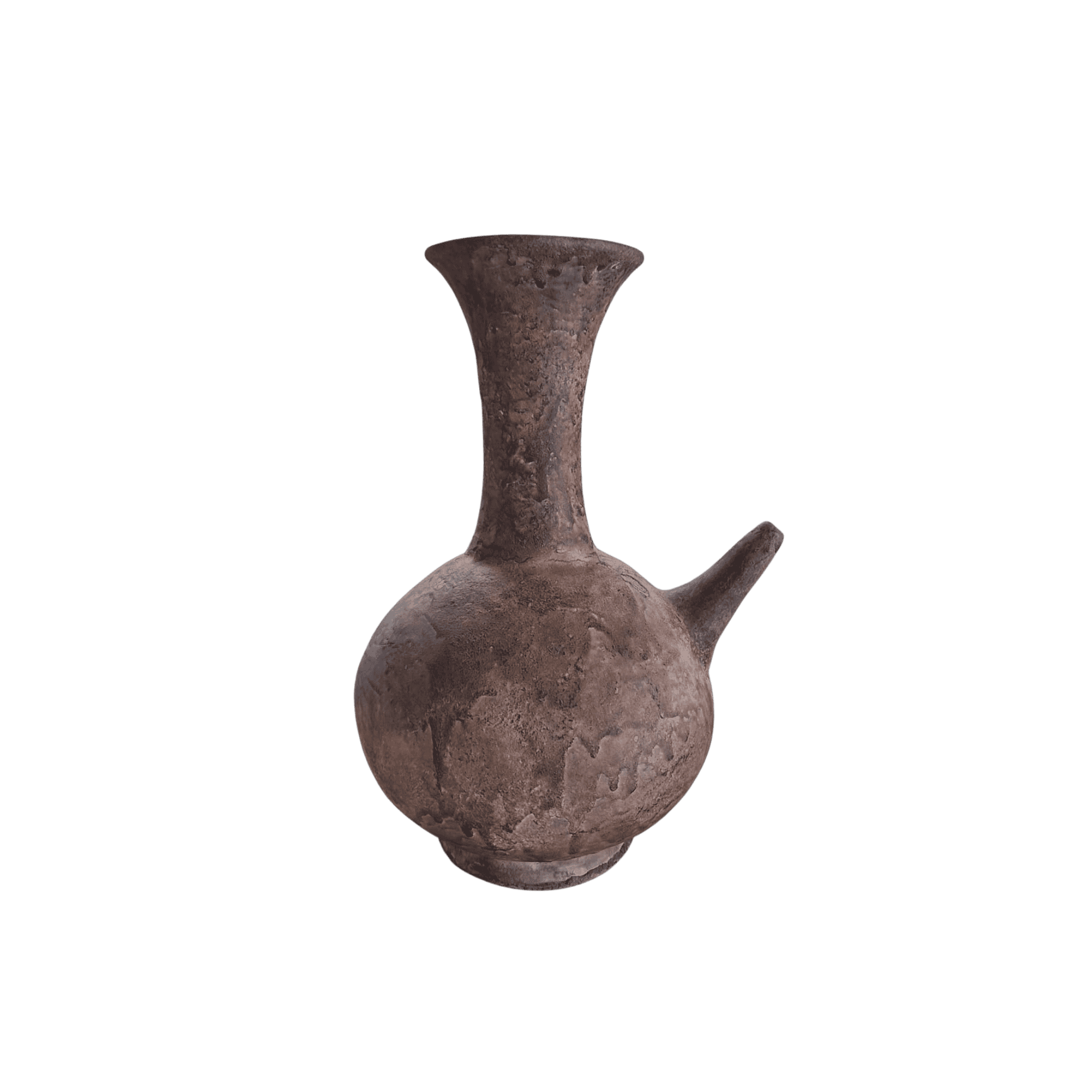 A handcrafted pottery vase with a rounded body, elongated neck, and sculptural side spout, designed as a distinctive decorative statement.