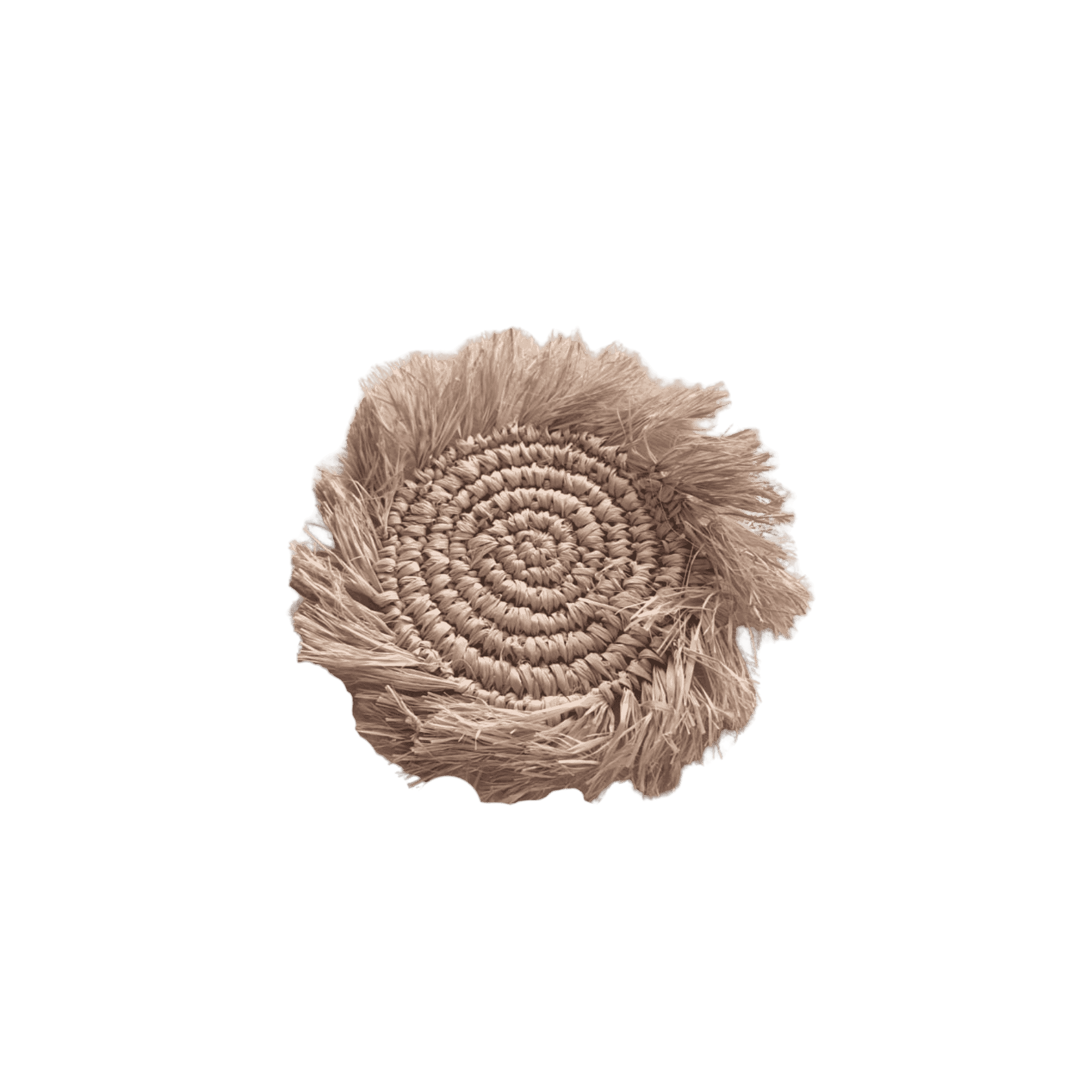 A handcrafted seagrass coaster with a woven texture, designed to protect surfaces while adding a natural decorative touch.