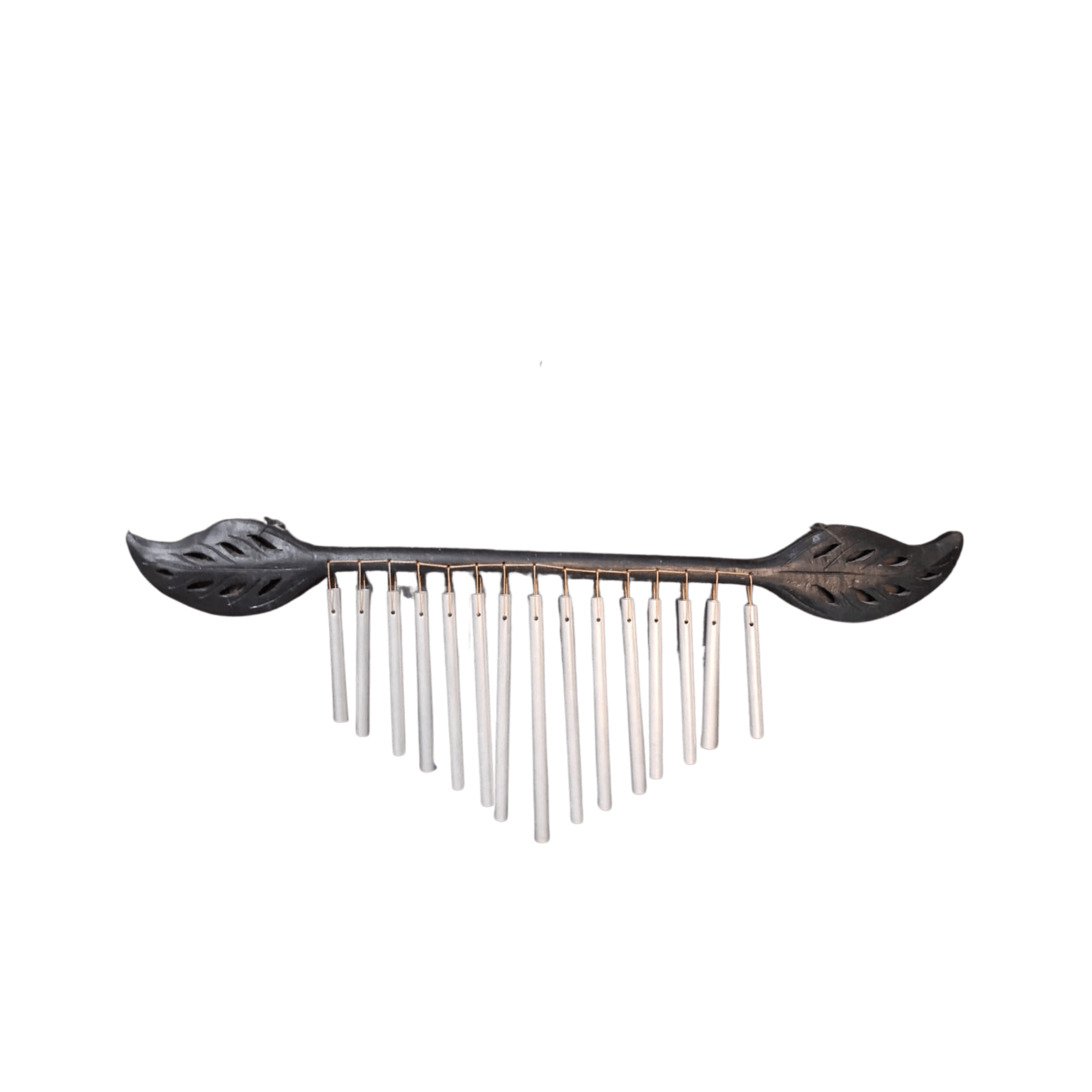 Elegant leaf-inspired windchime crafted from wood and metal to create soothing natural melodies.