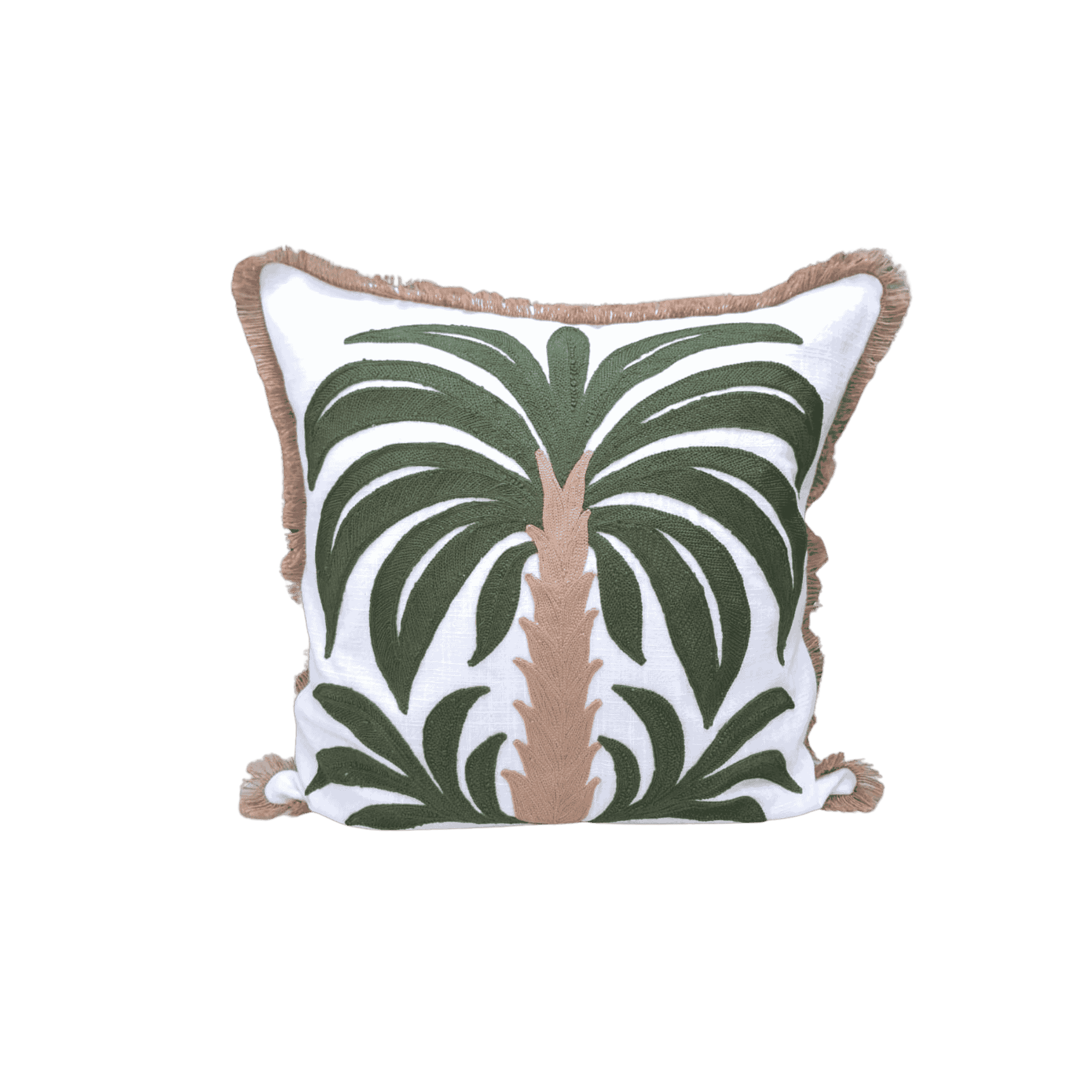 An embroidered palm tree cushion cover with natural fringe details and a fresh tropical aesthetic.