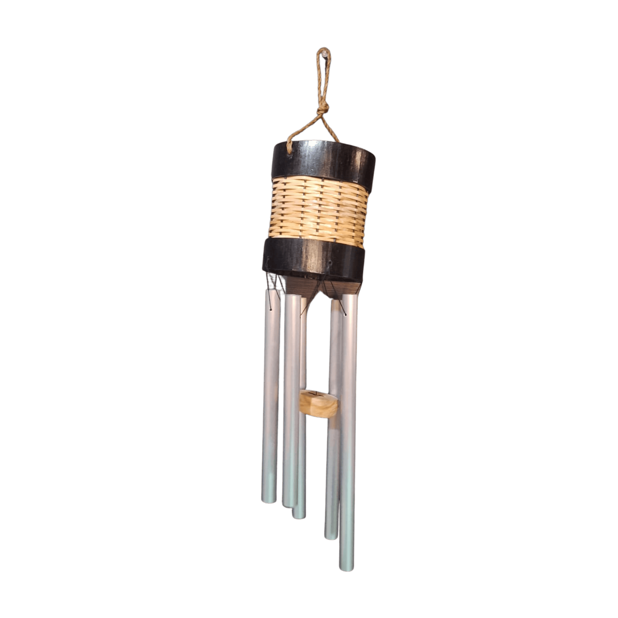 Handcrafted round basket windchime with steel tubes that create soothing, melodic tones.