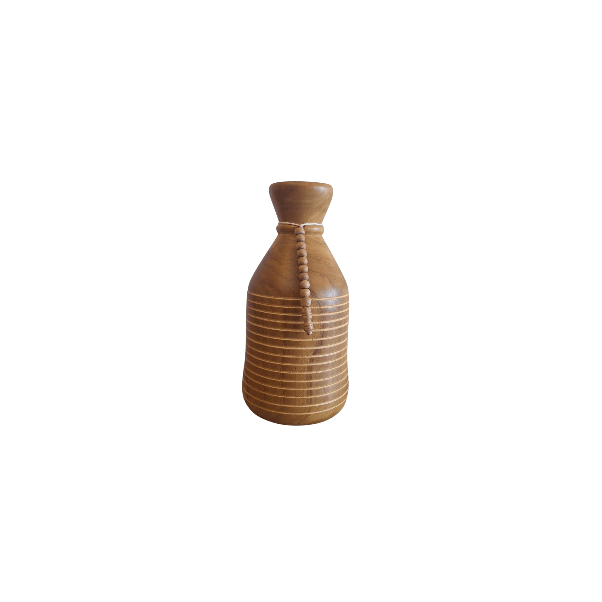 A handcrafted wooden vase accented with decorative wooden beads, designed as a unique artisanal décor piece.