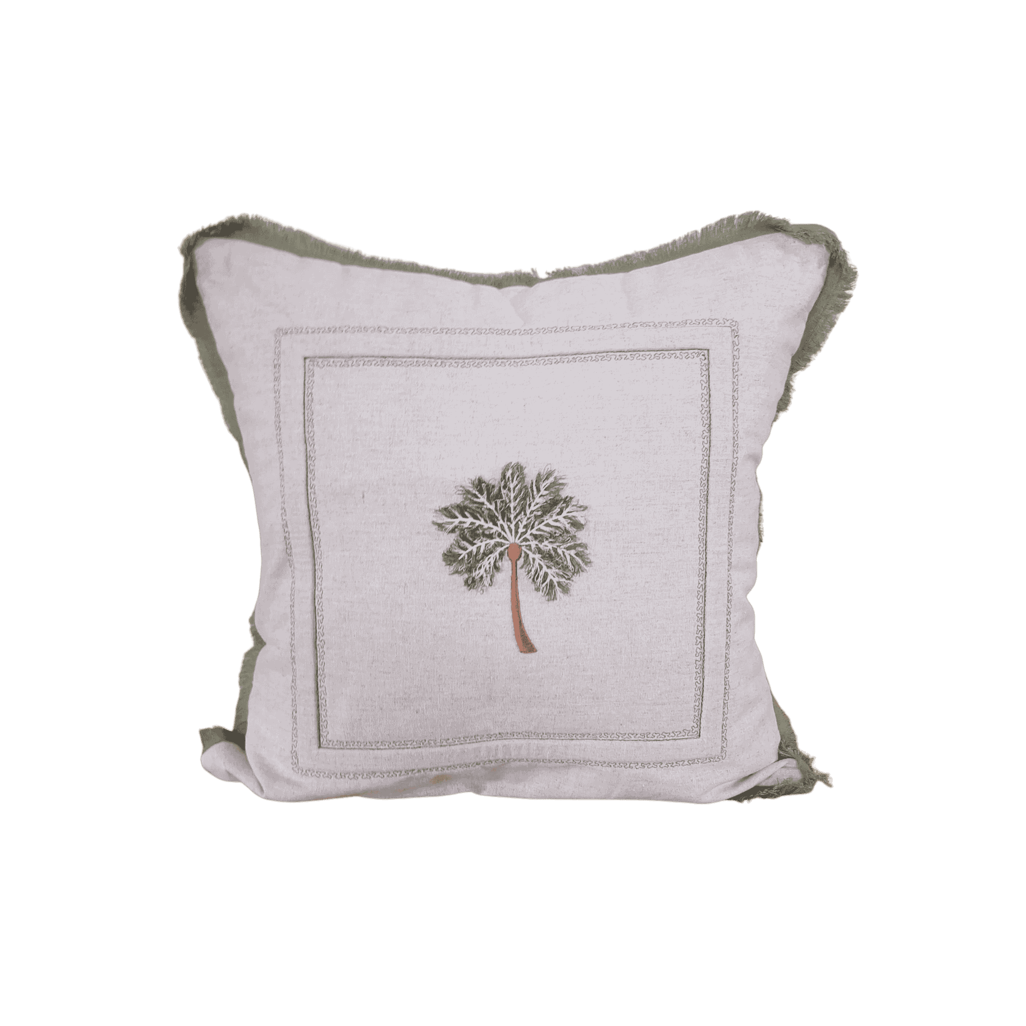 A refined cushion cover featuring delicate palm tree embroidery, framed with subtle stitched borders and finished with soft fringed edges. Designed to bring a calm, tropical elegance into any living space.