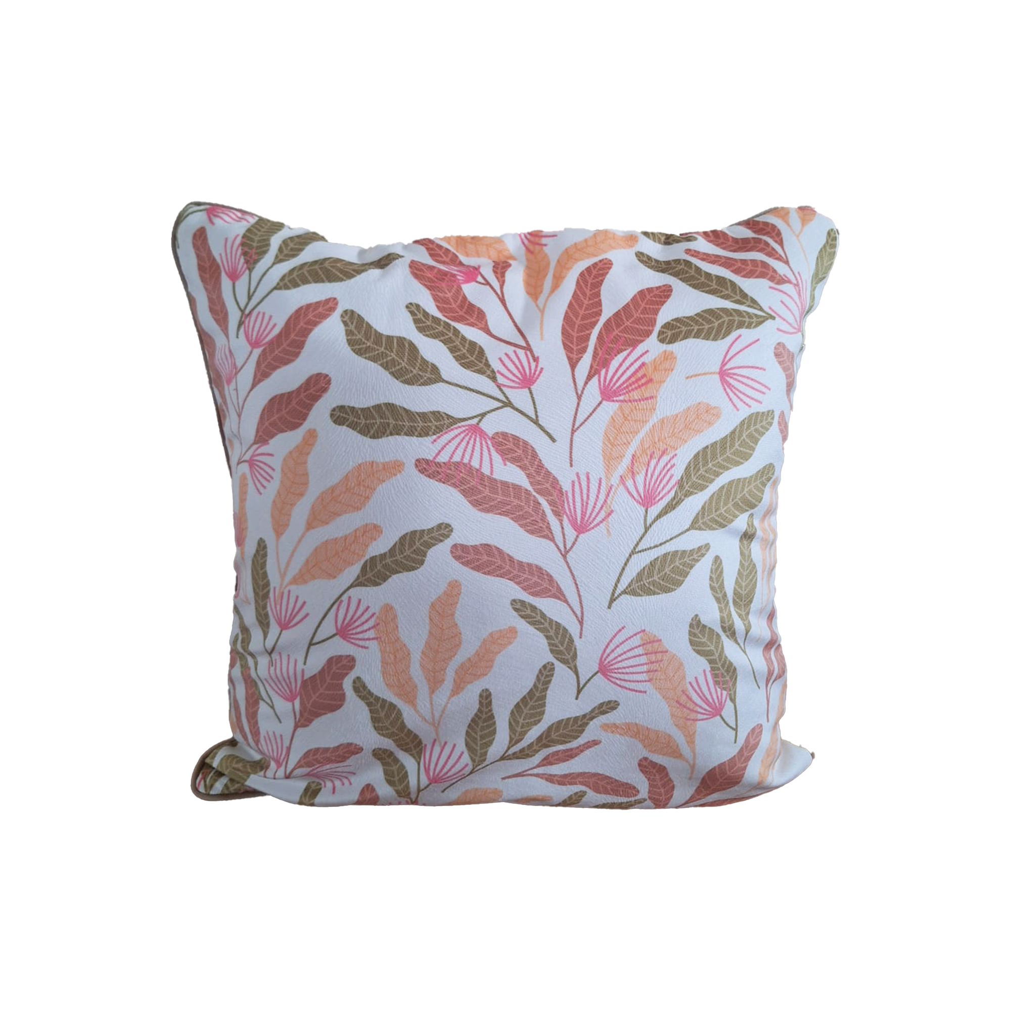 A soft printed cushion cover featuring delicate botanical leaves in warm blush and earthy tones, perfect for creating a calm and refined interior ambiance.
