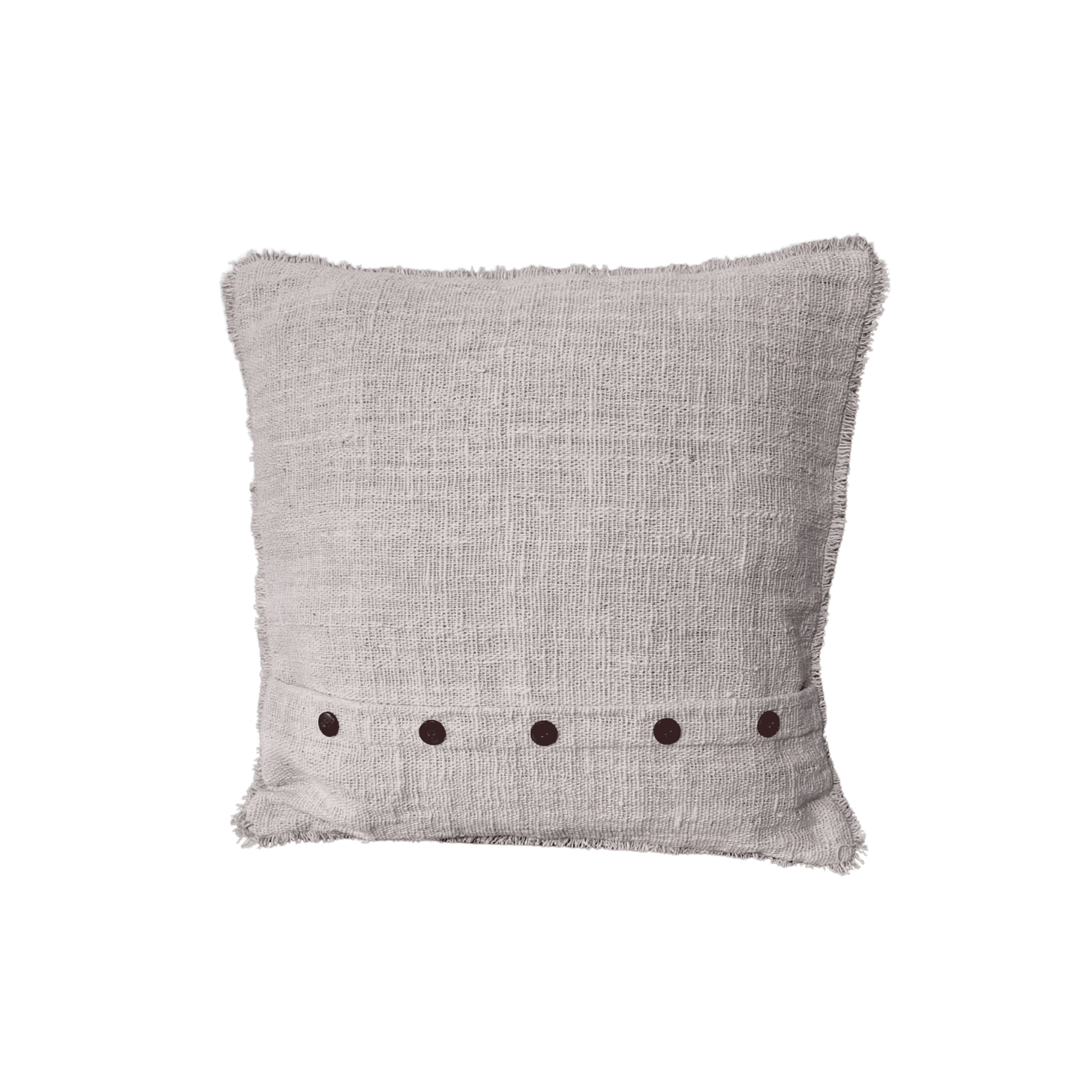 A minimalist cushion cover with textured fabric, button accents, and soft frayed edges for a relaxed, natural style.