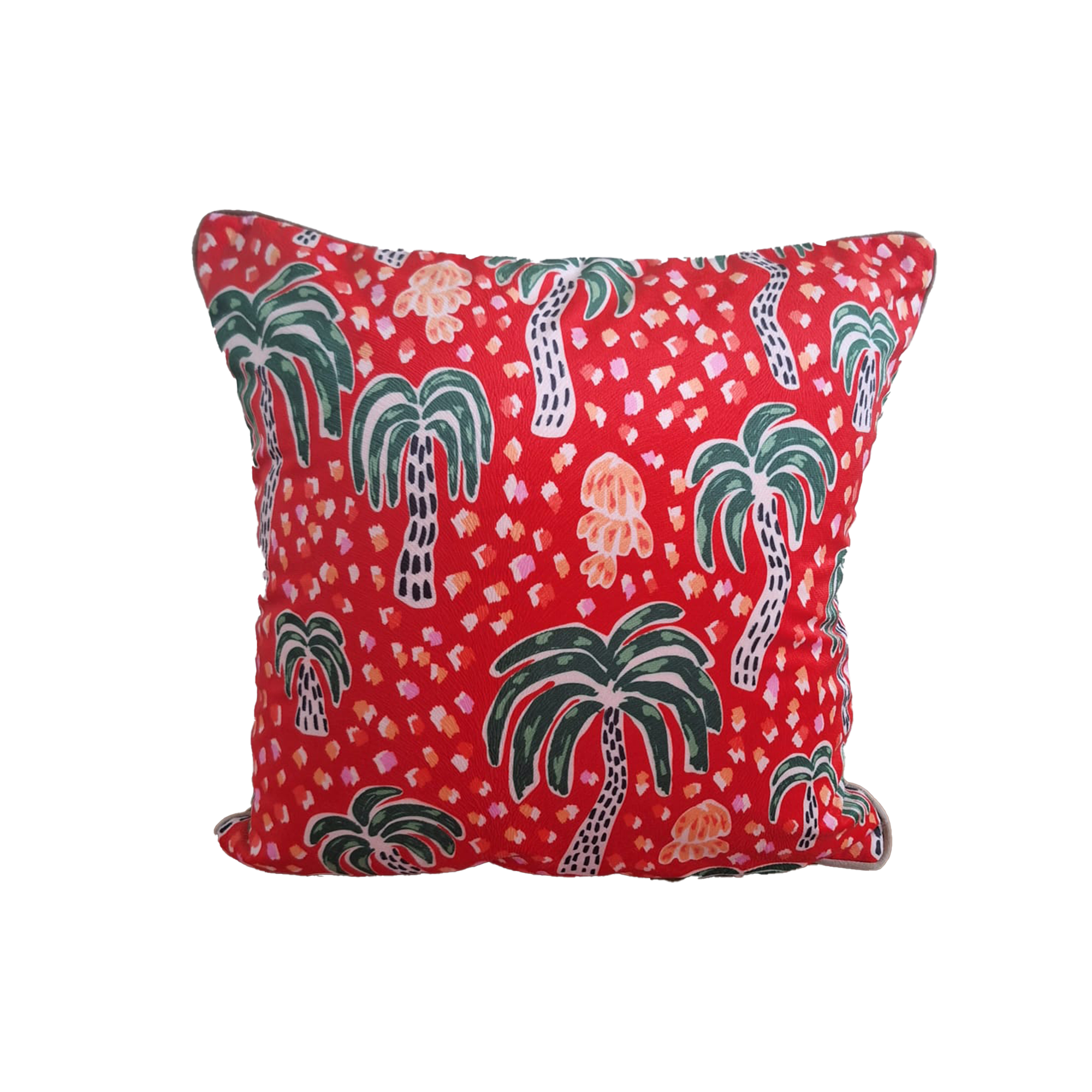 A vibrant printed cushion cover featuring playful palm tree motifs on a bold scarlet background, bringing a lively tropical charm to any living space.